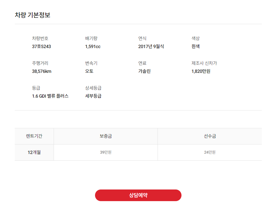 렌트 방식: 선수금 및 보증금 -) 이건 거의 모든 차량이 사실 두가지 모두 가능하기 때문에 본인이 원하는 걸 고르시면 됩니다.