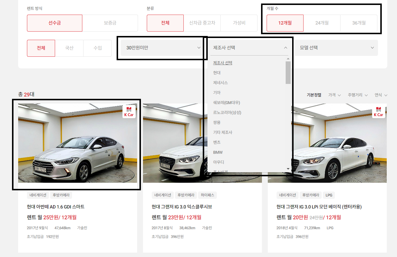 개월 수: 12, 24, 36개월로 나눠져 있으며, 각 개월 수마다 가능한 차량이 상이합니다. 그렇기 때문에 개월 수는 본인이 원하는 것으로 먼저 골라주셔야 합니다