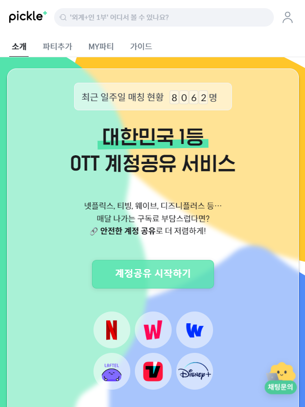 따로 혼자서 계속해서 오르는 OTT 요금제를 감당하기 힘들 분들을 위한 서비스로, 개인적으로 원하는 OTT 서비스를 선택해서 파티원을 매칭하여 요금제를 분할하여 진행할 수 있는 서비스죠.