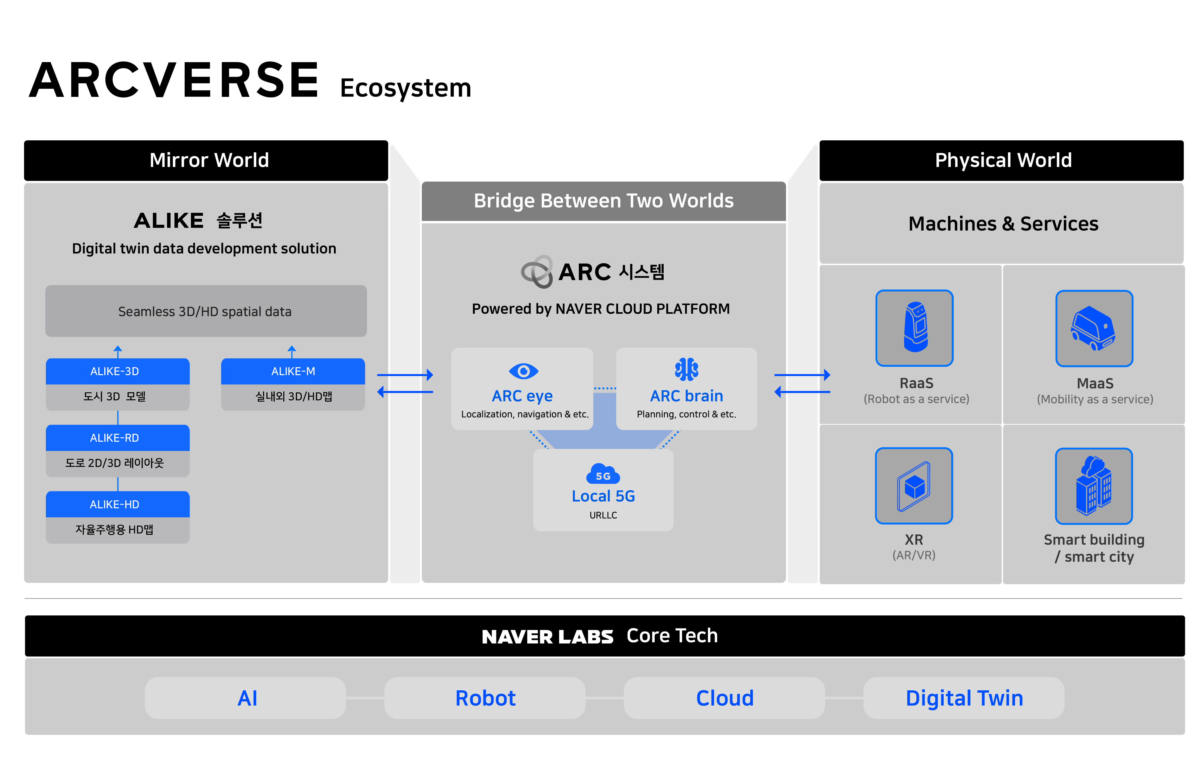 아크버스: 현실과 똑같은 가상 세계를 창조하는 디지털트윈, 현실 세계와 직접 인터렉션이 가능한 로봇, 자율주행, 증강현실(AR), 두 세계 가교 역할을 하는 5G, AI, 클라우드 시스템으로 완성될 아크버스에는 현실공간과 디지털공간 데이터 및 서비스가 서로 유기적으로 상호작용하게 될 세계