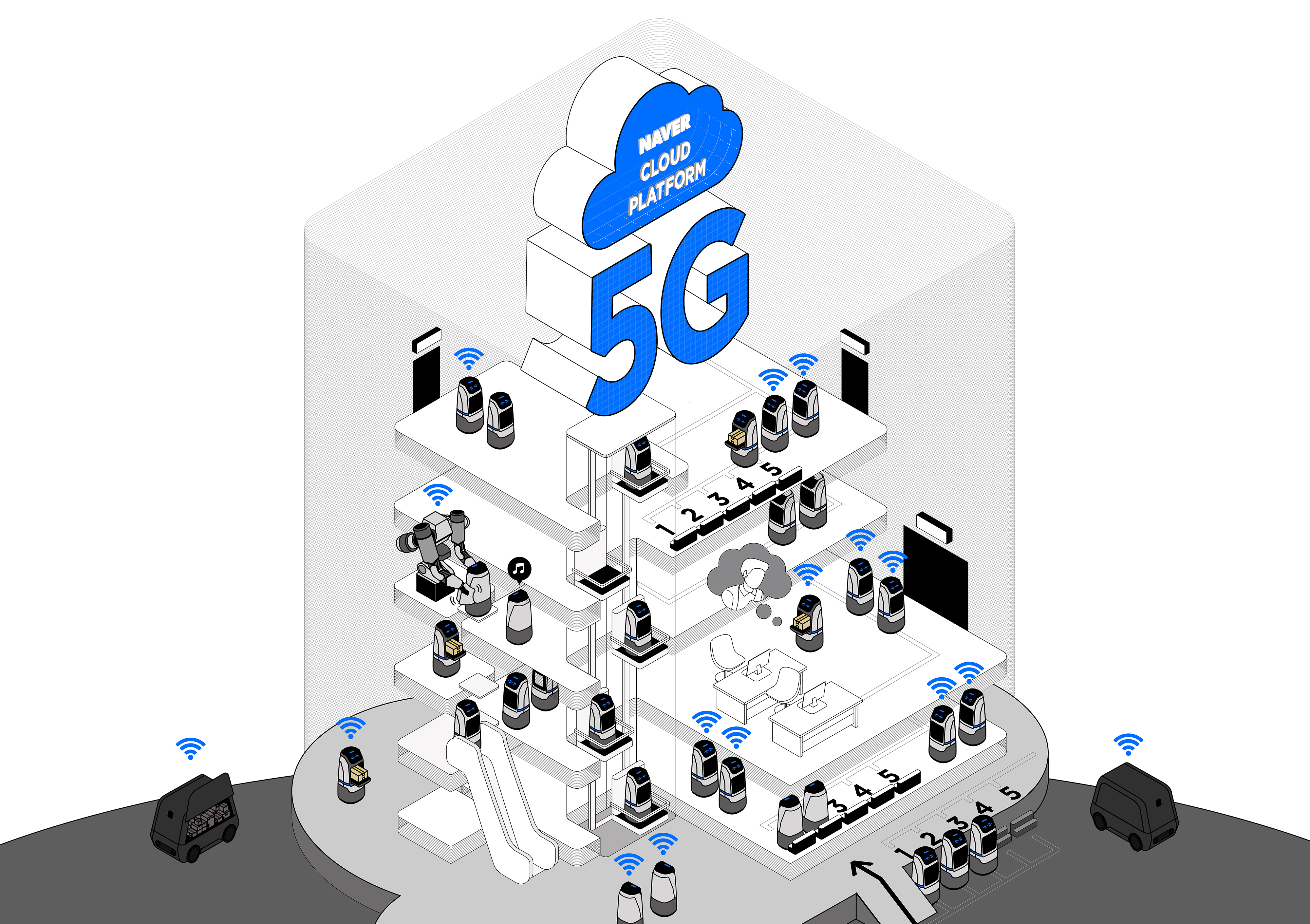 로봇과 사람이 공존할 건물이라니.. 여기에는 로봇 엘리베이터나 전용로가 있고, 아주 수많은 로봇들이 돌아다닐 예정이라고 합니다. 더군다나 이 로봇들의 특징은 두뇌에 해당하는 컴퓨터를 본체가 아닌 네이버 클라우드에 둔다고 하네요. 즉 이때 클라우드와 로봇을 잘 이어줄 통신 선능이 필요하고 이것이 5G가 필요한 이유입니다!