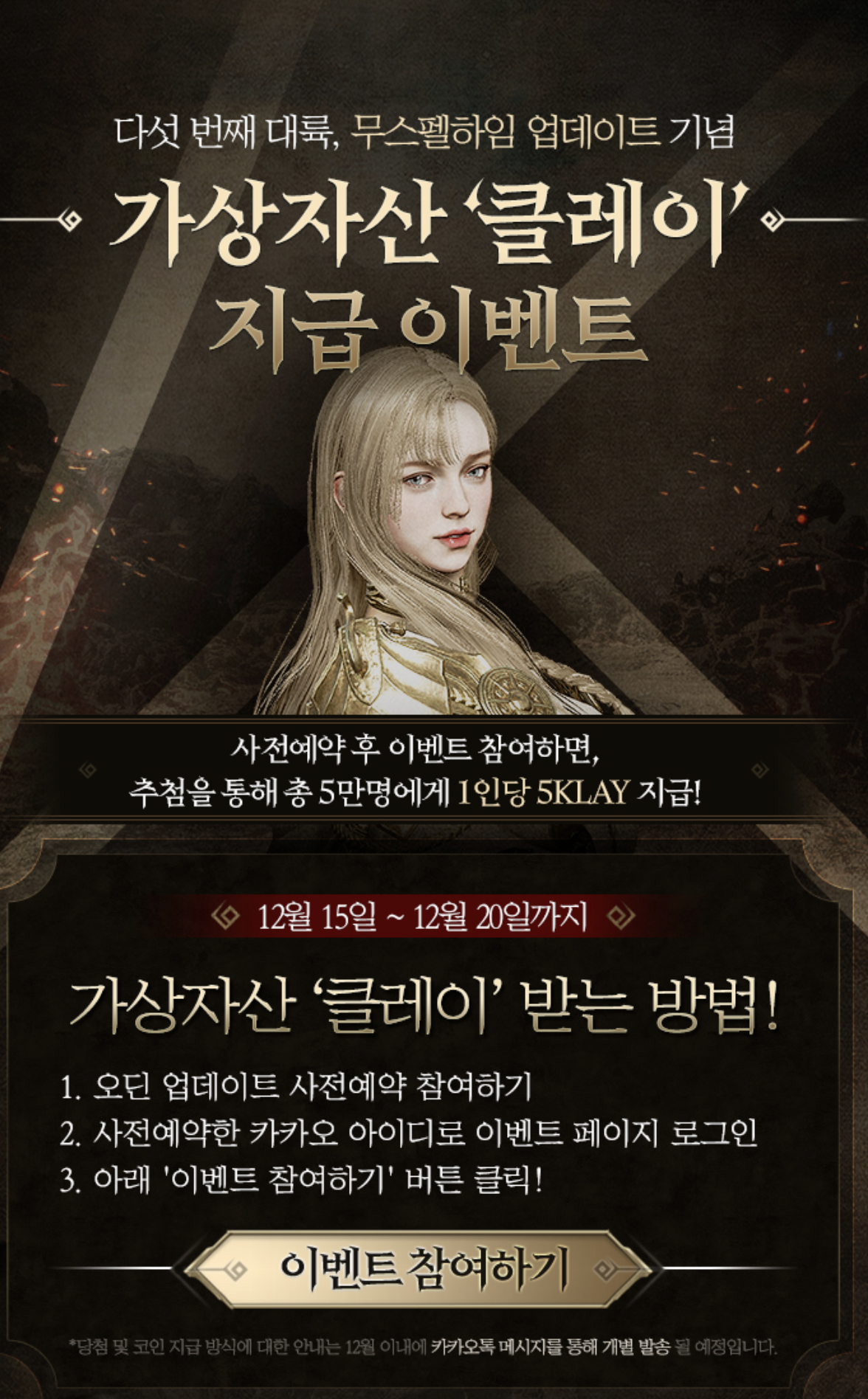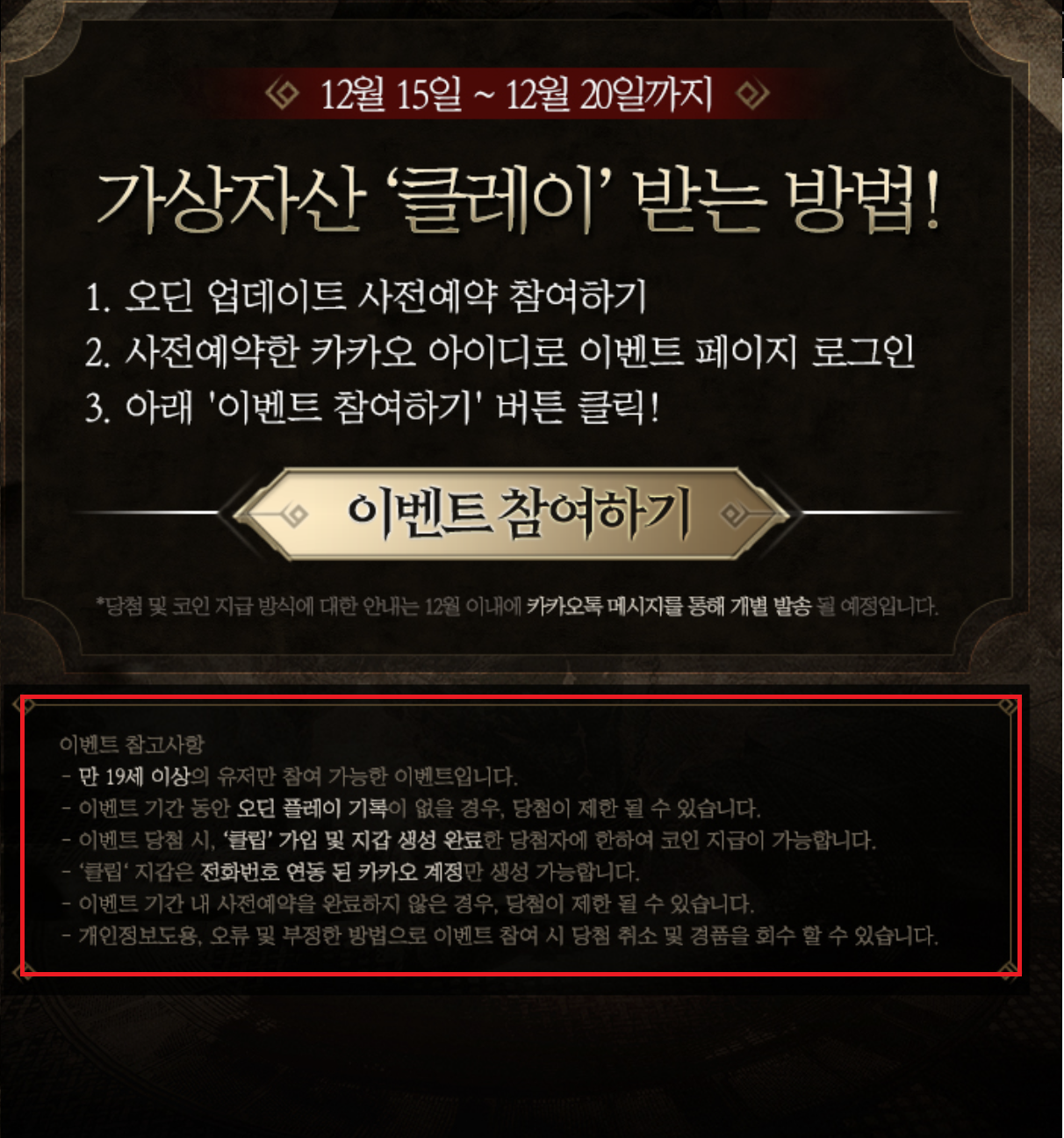 클레이 코인 당첨 및 코인 지급 방식에 대한 안내는 12월에 카카오톡을 통해 알려준다고 합니다.