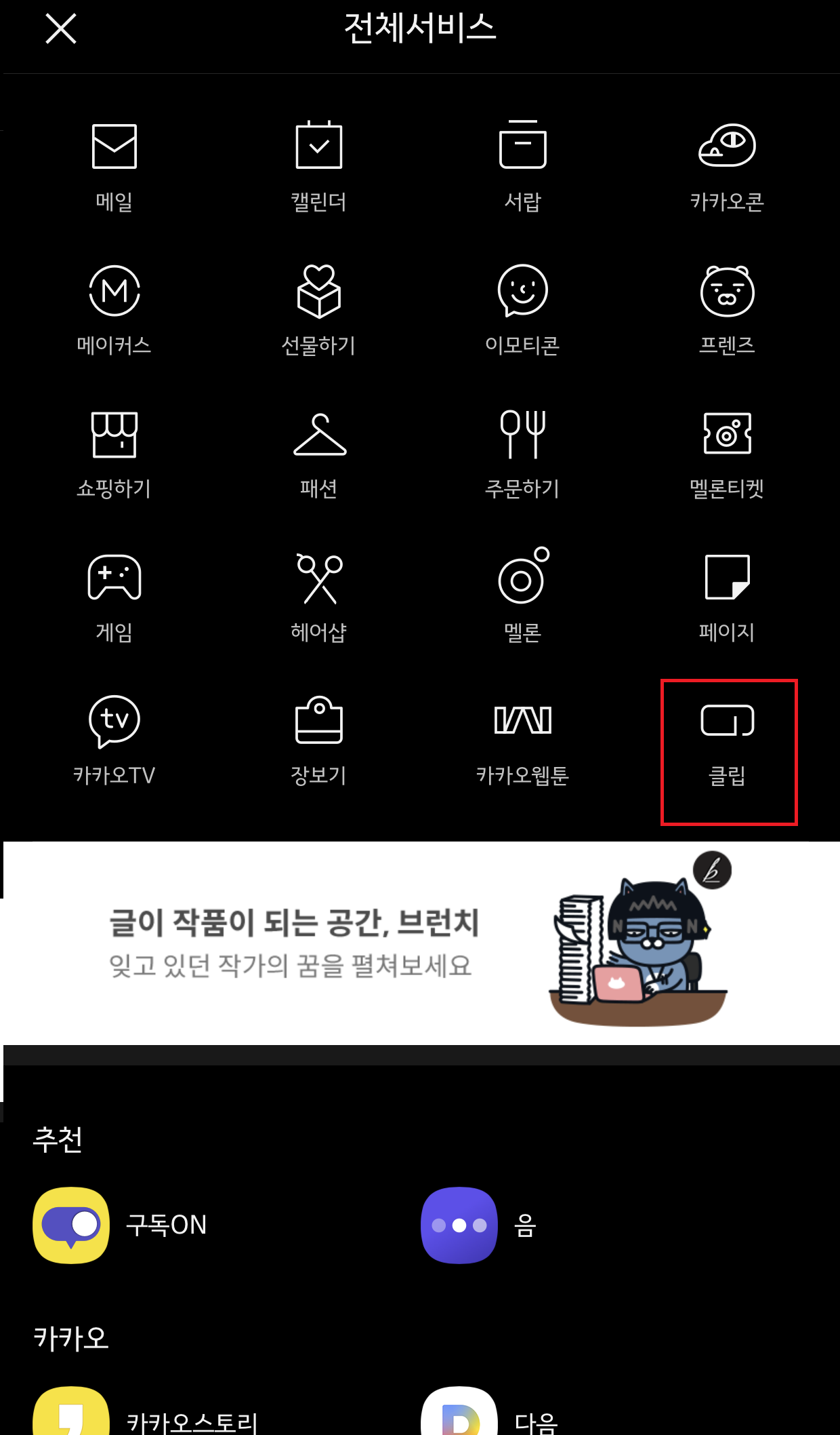 <1. 카카오톡에 들어가서 전체 서비스를 들어간 뒤, 클립에 들어간다>
